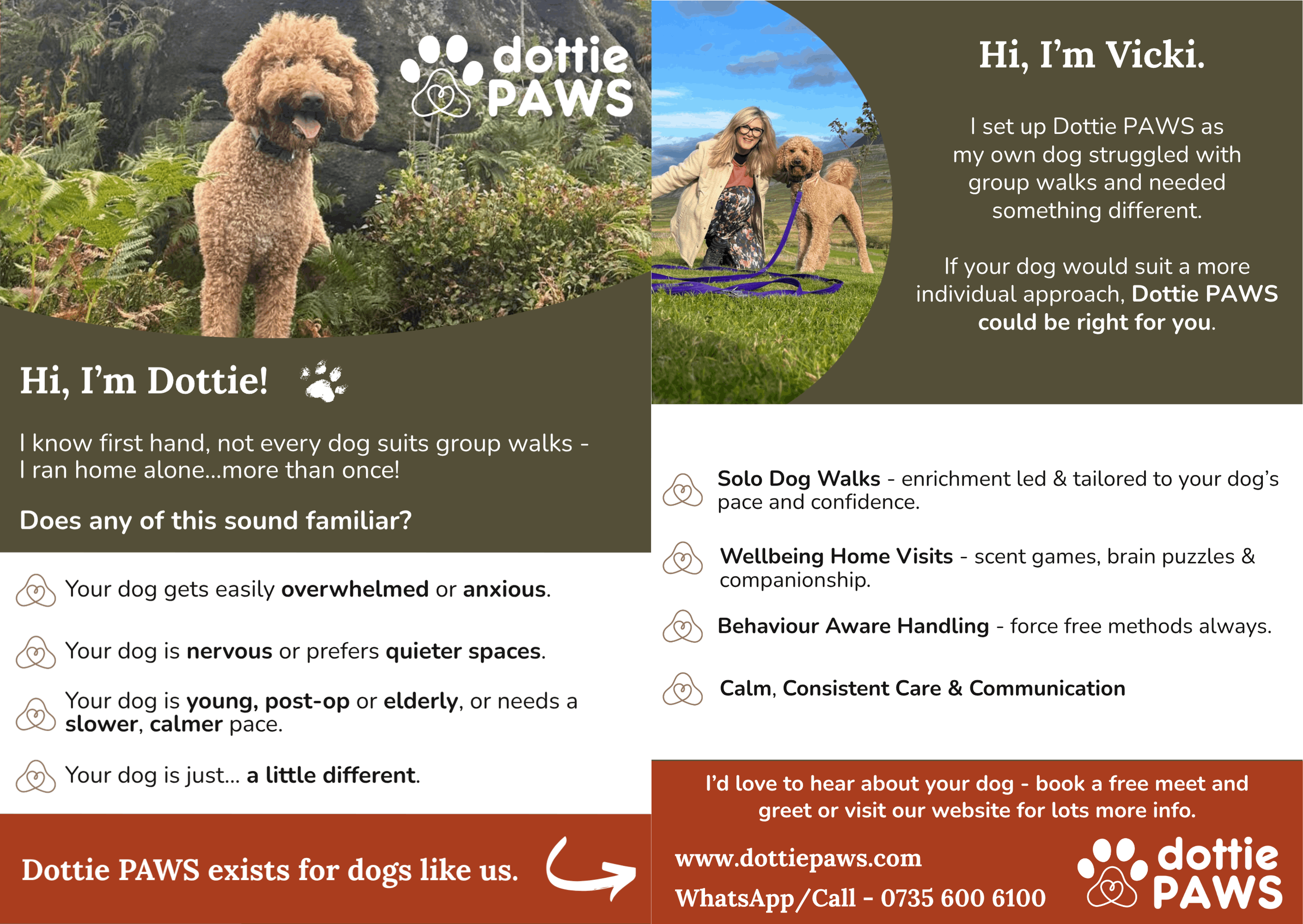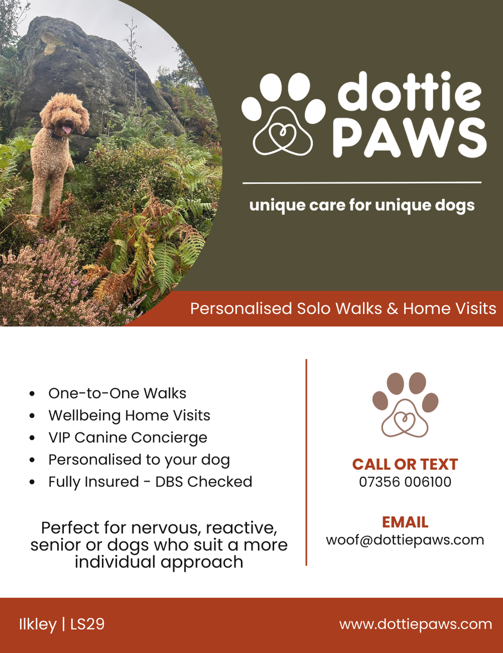 Dottie PAWS is a unique, newly launched, strictly 1:1 enrichment-led dog walking and dog wellbeing service, and is a great example of an owner-inspired and owner-managed small business enterprise.