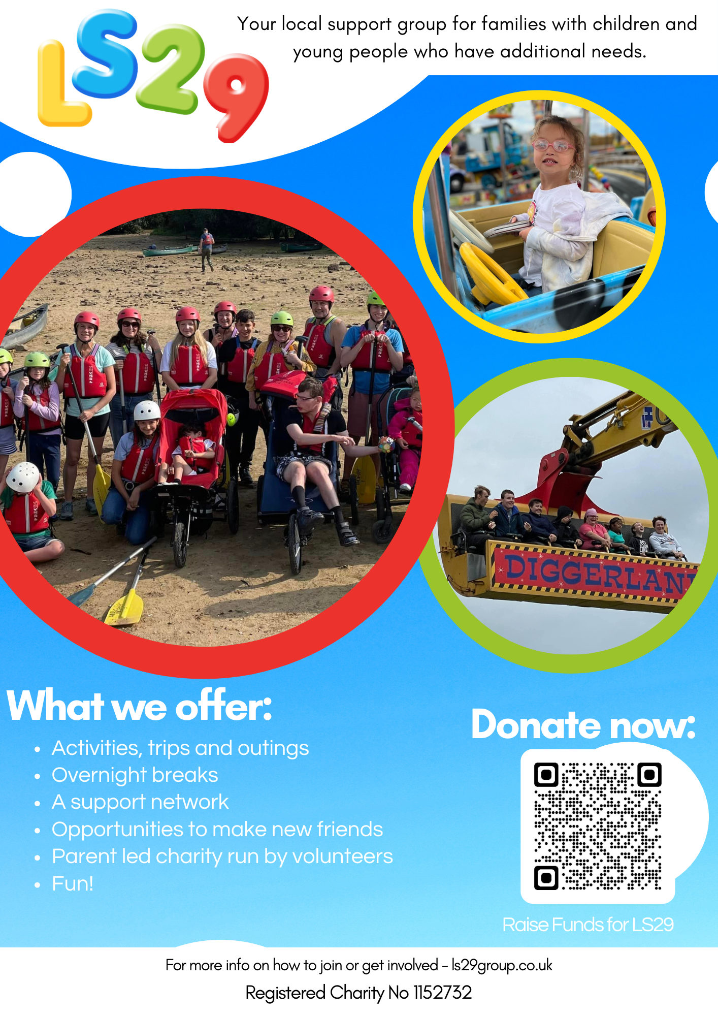 LS29 Special Needs Group provides after-school, weekend and school holiday activities for young people, their siblings and parents. Amongst its many aims, LS29 works to develop mutual support networks and friendships, and to help people try activities they wouldn't have had the confidence to do without the group.